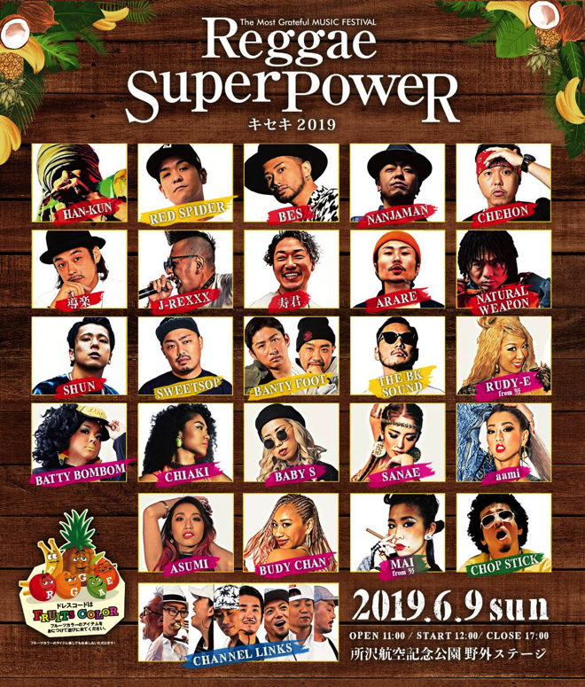 関東の人気レゲエフェス<REGGAE SUPER POWER -キセキ2019->が、6月9日(日)に埼玉・所沢航空記念公園 野外ステージにて開催される。
