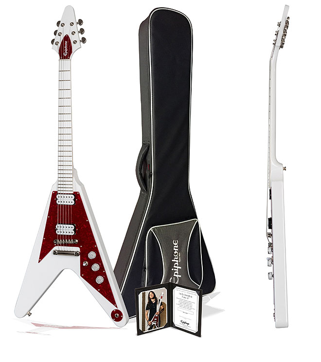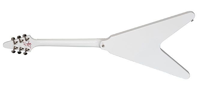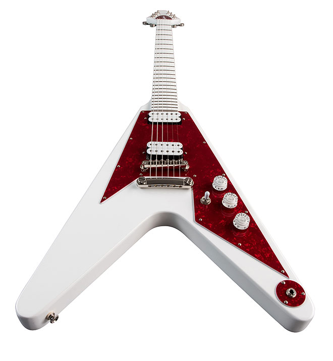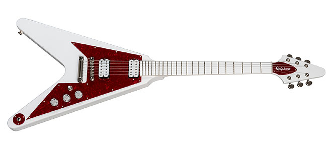 アルパイン・ホワイトのカラーに、赤いパーロイドのピックガードがクラッシックな趣のフライングVは、コイル・スプリット機能付きの「ProBucker」のハムバッキング・ピックアップ、グローバー製「Rotomatic」のチューナー、ジャンボ・フレット、「Graph Tech」ナットをフィーチャー。ボディとネックはマホガニー、指板はハード・メイプルを採用。スペシャル「EpiLite」ケースが付属する。