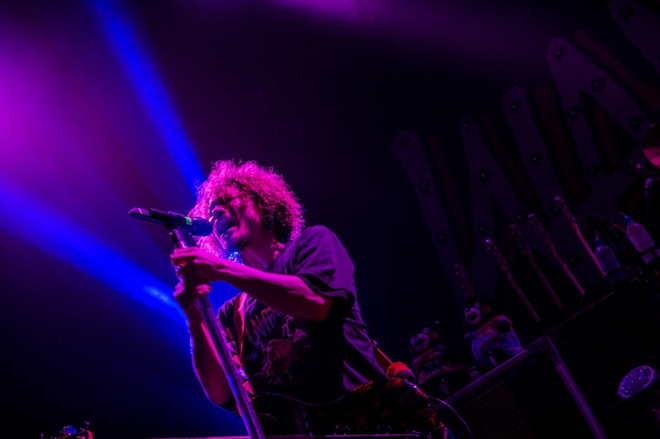 FUJIが扮したいつものあの人によるタイトルコールも秀逸だった「アゲイン」もハイライトのひとつ。KENTAの歌が響き渡り、会場全体をも包み込む多幸感によって心がどんどん温かくなっていく。想いが溢れんばかりにプレイするメンバーの表情も印象的だった。そして、多くの人の胸を打ったのが「りんどう」だろう。タイトルに地元熊本の県花をタイトルに据え、『Everybody!!』ツアーから披露しているこの曲は、まだ作品には未収録ではあるが、応援してくれるファンへ向けた内容であり、彼らが大事に現場で歌っている存在だ。必要最低限のバンドアンサンブルで奏でられ、願いがこめられた歌に対し、その気持ちが伝わっているのだろう、フロアからはスマホのライトが照らされ、より曲が鮮やかに彩られていた。