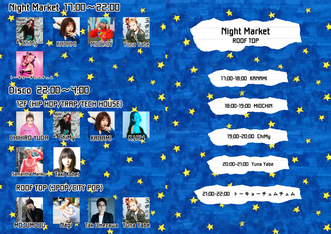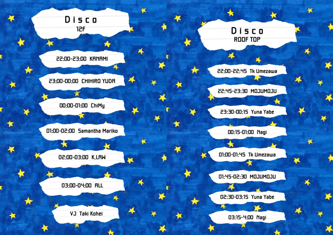 「Discoの部」と題された22時からは、名前そのままディスコタイムとなる。「ディスコの部は12階とルーフトップで雰囲気をガラッと変えました。12階は、テックハウス/ヒップホップ/トラップなどエッジの効いたフロアにします。しかもDJは全員女性です。一方のルーフトップはJポップ/シティポップがテーマ。歌って踊って飲めるハッピーなフロアにしたい」というChiMyの思いを受け、DJはSamantha MarikoなどPLUSTOKYOのレギュラーDJ陣を軸に12階/ルーフトップともにオトナの夜を盛り上げる。