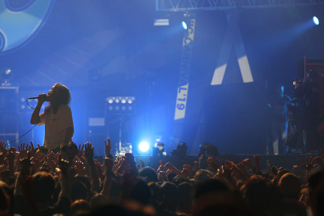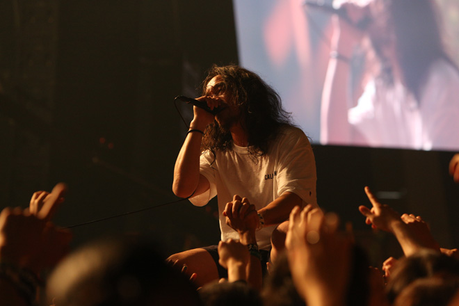 そんな「jam」から幕を開けたG-FREAK FACTORYのライブ。一瞬のブレイクで曲は「SOMATO」に入ると、さっきまで酔わせるようなバンド・サウンドが一気に加速し始めた。同時に茂木はストールを取り去り、やる気のみなぎる表情で言葉を吐き出す。疾走するハード・エッジなリズムにレゲエやラウドさが混然一体となり、そこに茂木の歌が絡む。全ての要素が熱を帯び、オーディエンスを覚醒しまくる。