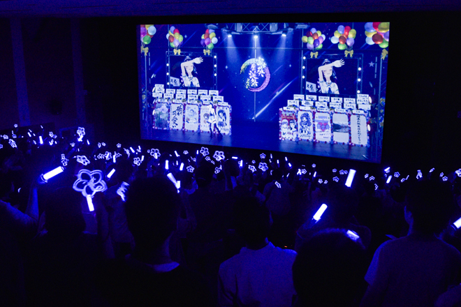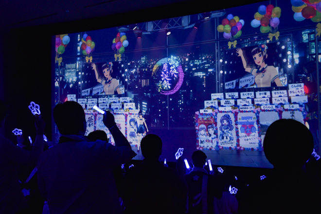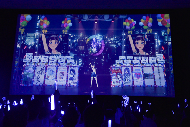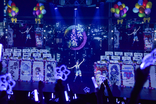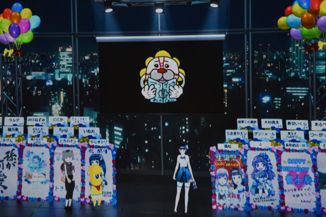 登場したばかりだというのに、興奮のあまり息切れを起こしている富士葵に団員から笑いが起こるなか、まずは親交のあるVTuberたちからのビデオメッセージが上映された。かしこまり、燦鳥ノム、夜桜たま、ばあちゃる、YuNi、ときのそら、田中ヒメ鈴木ヒナ、月ノ美兎、電脳少女シロ、ミライアカリ、猫宮ひなたが順番に画面に映り、個性あふれるメッセージで誕生日をお祝い。ときのそらからのメッセージのあとには、富士葵とときのそらによるラジオ番組『そらあおと!』がTOKYO FMにて7月からスタートすること、“そらあお”のファンコミュニティが開設されることが発表され、団員から喜びの声が上がった。