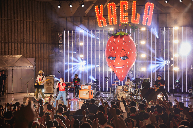 目が動く巨大なイチゴのオブジェが設置されたステージに、アイゴン(曾田茂一/G)、高桑圭(B)、キャシー(柏倉隆史/Dr)、テリー(中村圭作/key)と笑顔で行進しながら登場したカエラ。観客の拍手がそのまま自然とクラップとなり、ロックフェスの定番曲「Magic Music」で勢いよくライブをスタートさせ、「この日をだいぶだいぶ待っておりました。感謝の気持ちを込めて、最後まで一生懸命やるので、楽しんでください」とあいさつした。
