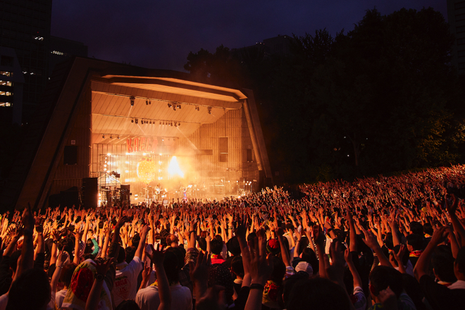 ヘヴィーなロックナンバー「TREE CLIMBERS」で会場の熱気をあげると、野音はライブハウスのような様相となり、「Yellow」では観客は拳を突き上げながらジャンプし、「Circle」では色とりどりのタオルが回され、「BEAT」ではカエラがエレキギターをかき鳴らして熱狂させた。