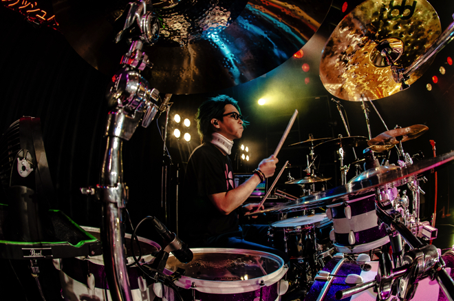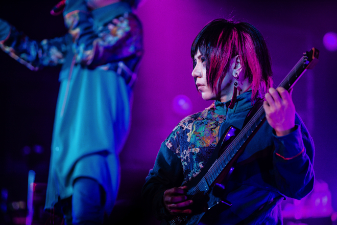 ステージでは、揃いの衣装に身を包んだメンバーが一様に同じ動きを見せるのではなく、それぞれ見せ方に変化をつけている。青髪にリニューアルしたマモは「フラッシュバック」の世界観を表すかのようにサビの部分で手首を何度も擦りながら歌い、Z(G)と楓(G)の両ギタリストは、異なるアプローチで曲に華を添えていく。それにしても、このツアーで楽器陣の音と動きが格段に良くなった気がした。さすがはライヴバンドR指定、1ツアーでここまで飛躍的に伸びるとは恐ろしいものだ。