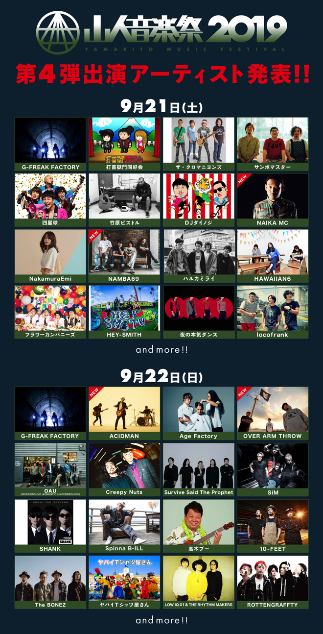 9月21日(土)、22日(日)の2日間、群馬・ヤマダグリーンドーム前橋にて開催されるG-FREAK FACTORY主宰のロックフェスティバル<山人音楽祭2019>の出演アーティストの第4弾発表が行なわれた。