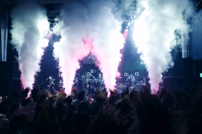 その後はメタリックなサウンドとキャッチーなサビパートを活かした「暁」やドラマチックに疾走する「影」、レトロ感が生み出す“尖り”をフィーチュアした「ベラドンナリリーにナイフを添えて」、ハイエナジーな「家族ごっこ」などを相次いでプレイ。MCどころか曲間を開けることもなくハードチューンを畳み掛けてくる構成に、圧倒されずにいられない。アグレッシブに突き進むライブでいながら常にサウンドがタイトなこともさすがの一言で、今回のツアーを通して彼らのアンサンブルにさらなる磨きがかかったことを感じさせた。