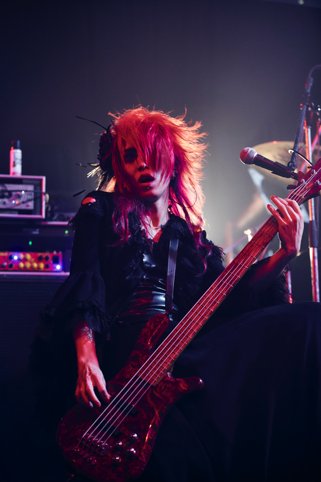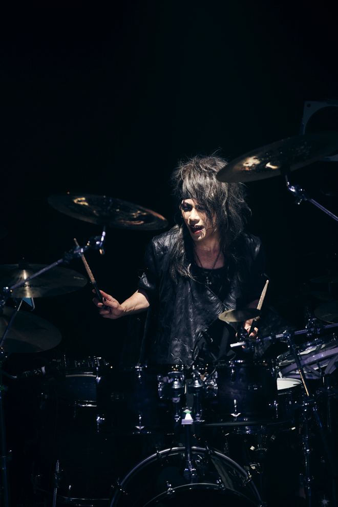 ライブは、ハードかつメロディアスな「Vanish」で幕を開け、ヘヴィな「-ガラシャ-」に移行する流れからスタート。青白い炎を思わせるミステリアスなオーラを発しながら、力強さと妖艶さを併せ持った歌声を聴かせる遼(Vo)。クールな表情で、テクニカル&エモーショナルなギターソロを奏でる紫月(G)。エレキギターとアコースティックギターを自在に操るスキルの高さと激しいステージングのマッチングが印象的な氷龍。膝の辺りにベースを構えて、重厚にうねるグルーブを紡いでいく憂璃。ビートチェンジや手数の多いフィルを多用した、緻密なドラミングを展開する或(Dr)。感情を駆り立てるアグレッシブなサウンドと激しくパフォームするメンバー達の姿にオーディエンスのボルテージも一気に高まり、ライブが始まると同時に場内は熱気に包まれた。