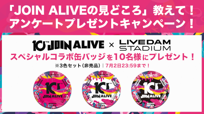 募集期間は7月2日(火)23:59まで。アンケートにご回答いただいた方の中から抽選で10名様に「JOIN ALIVE×LIVE DAM」スペシャルコラボ缶バッジ3色セット(非売品)をプレゼントいたします。下記「キャンペーン概要」内の各事項をご参照の上、奮ってご参加ください。