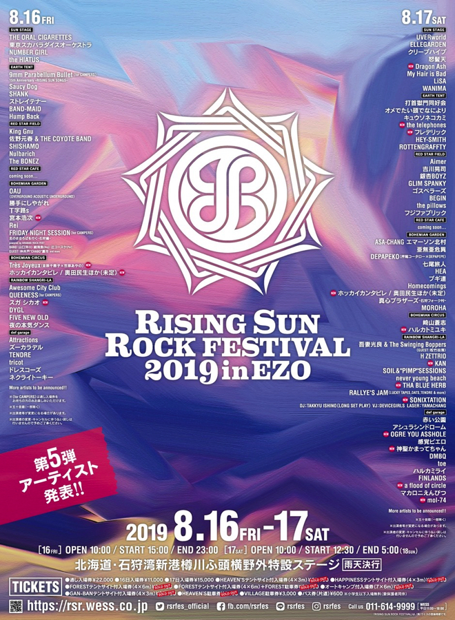 8月16日(金)、17日(土)に北海道・石狩湾新港樽川ふ頭横野外特設ステージにて開催される<RISING SUN ROCK FESTIVAL 2019 in EZO>の第5弾出演アーティスト発表が行なわれた。オフィシャルサイトでは各アーティストの出演ステージも公開されている。