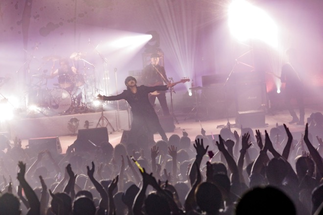 ほぼ定刻通りに客電が落ちると、ステージを覆っていた紗幕に映像が映し出された。人が持つそれぞれの個性をイメージさせるような、さまざまな色が白い背景に描かれていき、ときにそれらが混ざりあう。そして最後に、メンバー4人をイメージした色を中心に“励”の文字が彩られた。今回のツアーの発端であり、テーマとなっているその一文字でバンドの想いを伝えると、紗幕が切って落とされ、ライブは「Only Lonely Crazy Heart」で勢いよくスタートした。