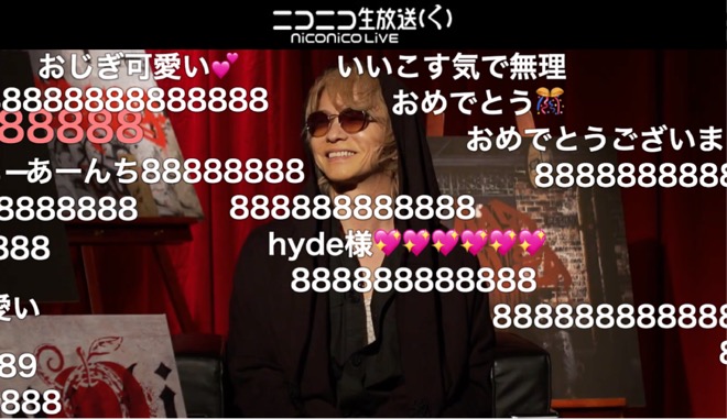 HYDEが登場した番組開始直後から、“おめでとう”や“88888”をはじめとする大量のお祝いコメントが寄せられた。これにHYDEは、「人の (ニコニコ生放送) は出たことがあるけど、僕の番組が始まったんだなと」と感慨深げに語った。今後、チャンネルでどういった生放送をやっていきたいかを聞かれたHYDEは、「地味な感じがいいな。布団の中に入って寝ながらしゃべるとか」と提案。これにはファンも“見たい!” “布団いい!” “最高でしかない……”と大盛り上がり。