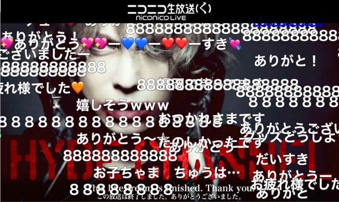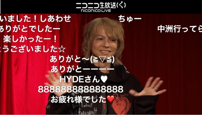また、ビデオの中でYOSHIKIは、「これ、『HYDE CHANNEL』へのお祝いメッセージなの? え!? 『HYDE CHANNEL』がオープンしたの?」と何に対してお祝いコメントしていたのかわかってなかったことが明らかとなり、“wwwww” “よっちゃんカワイイ”など、YOSHIKIの茶目っ気に対する微笑ましいコメントも流れた。さらに、niconicoでのコラボを提案した際には、“楽しみにしてます!!!”や“伝説作ってくださーい!!!”などのコメントで大盛り上がりとなった。