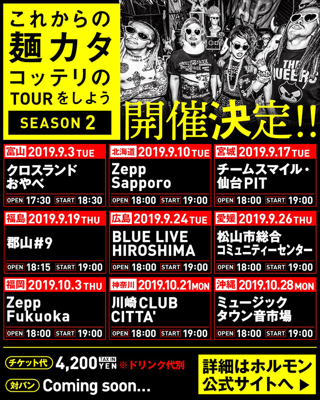 地元・八王子からスタートし、各地の対バンにMAN WITH A MISSION、ヤバイTシャツ屋さん、GOOD4NOTHING、BiSH、coldrainとホルモンならではの多彩なゲストを迎えて東名阪5カ所で開催されたSEASON1では、昨年2018年11月にCD付き書籍として発刊された『これからの麺カタコッテリの話をしよう』収録の新曲もパフォーマンス。ライブに飢えた腹ペコなファンへ、9か月のブランクを感じさせないへヴィなライブを披露してきた。