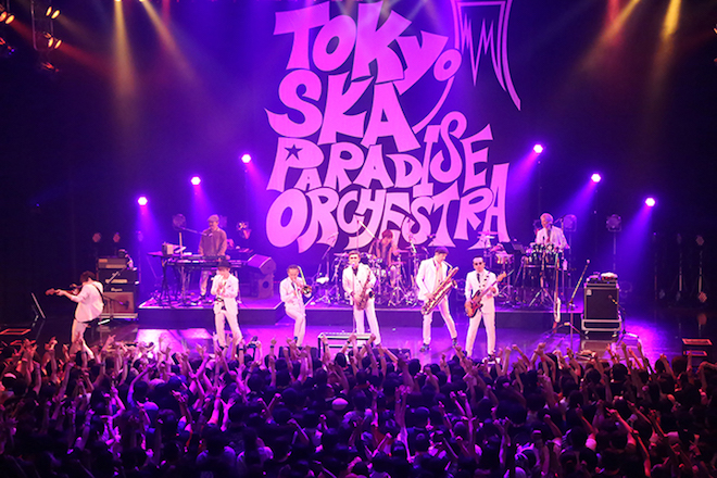 スカパラ30年の歴史を彩ってきた楽曲でつながれたオープニングSEが超満員に膨れ上がったオーディエンスの気持ちを煽るなか、9人の男たちのシルエットがステージ上に現れるとさらなる大歓声が沸き起こる。「トーキョースカで盛り上がる準備はいいか!」と谷中敦(B.Sax)がシャウトし、「Are You Ready To Ska?」でライブの幕があがる。「5 days of TEQUILA」、「DOWN BEAT STOMP」が続けざまに披露され、ライブ開始3曲ですでにライブを終えたかのような熱量がステージ上の9人からもオーディエンスからも発せられている。