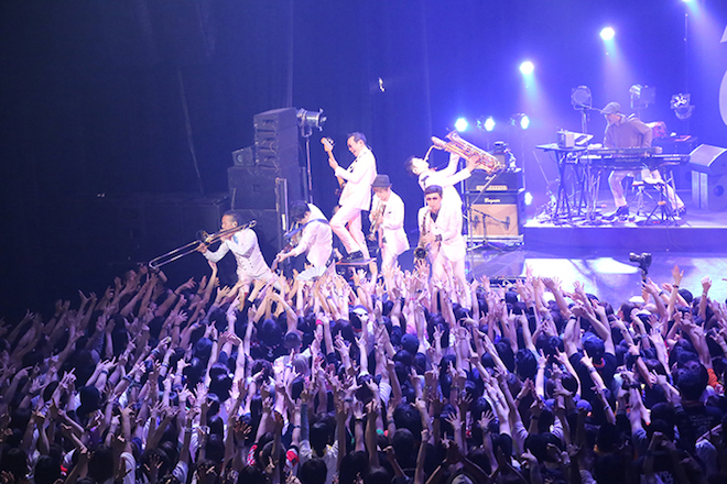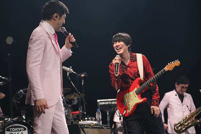 沖の口笛とアコーディオンで紡がれるメロディーが場内を“泣き笑い”が内包したような不思議な空気に変えていく。茂木欣一(Dr)が「タイムマシーンがあって、100年後の学校に行って、音楽の教科書を開いたら「君と僕」の譜面が絶対にあるから。何百年経っても不滅の名曲だと思います。」と沖に対する賛辞を贈ったあとは、茂木自身がボーカルを務める「銀河と迷路」が披露される。「Paradise Has No Border」のイントロが流れだすと一際大きな歓声があがり、GAMO(T.Sax)が激しくオーディエンスを煽ってさらなる熱狂を生みだしていく。と、GAMOが突然「今夜のスペシャルゲストを紹介します!フジファブリック!」と叫び、フジファブリックをステージに呼び込むと、完全シークレットだったこともありオーディエンスから大歓声が沸き起こる。