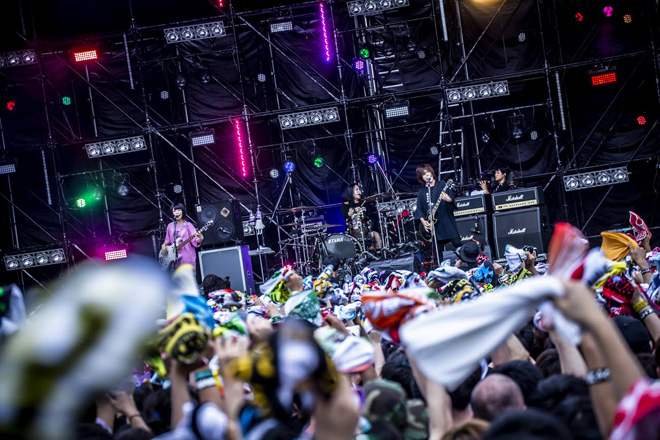 「ついにやってきましたよ、源氏ノ舞台に。京都大作戦は思い入れが強くて、何を隠そう僕は京都府宇治市出身でございます。今日も、うちの実家通ってここにきたもんな。1回目から欠かさず来ているフェスだから、アーティストのなかでは10-FEETの次に大作戦のことは知り尽くしてます」とこやまが語る。そして「知り尽くしてるってことは、どうすればお客さんが盛り上がるかも知ってるんです。京都大作戦では、いろんな盛り上がり方教えてもらいました。タオル回す曲、やってもいいですか?持ってない人は、手首腱鞘炎になるくらい回してもらっていいですか!」と続けると、フェスにうってつけのラウドで痛快な「L・O・V・E タオル」を観客の掲げるタオルの波に投下。間髪入れずにファストチューン「とりあえず噛む」を連投すると、今度は観客が一斉に波打つようにジャンプする。さらに高くジャンプさせるように、ギターのリフとリズミカルなタッチのしばたのベースが気持ちよく絡んで、地面が波打っているような壮観なシーンを源氏ノ舞台に広げていった。
