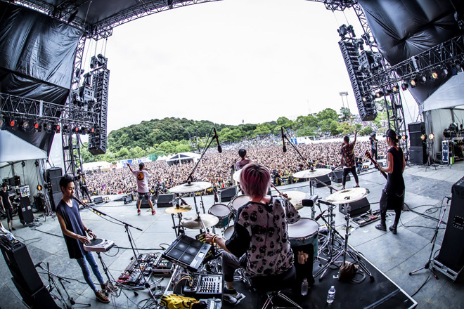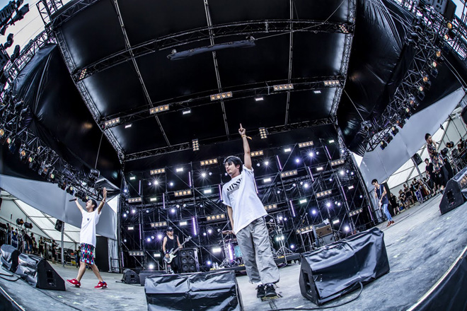 そしてラストは、これが聴けないと終われないキラーチューンを2連発。NAOTO(G)が奏でるイントロのギターリフから、観客の興奮のボルテージをあげていく「イケナイ太陽」、そしてタイトなドラムビートとエフェクティヴなベース、中毒性のあるヘヴィなギターリフ、そしてあちこちから弾丸のように飛んでくる3声のラップという、全員で前のめりに観客へ襲いかかる「キリキリマイ」で、クライマックスを迎えた。