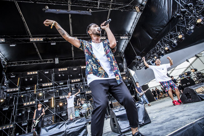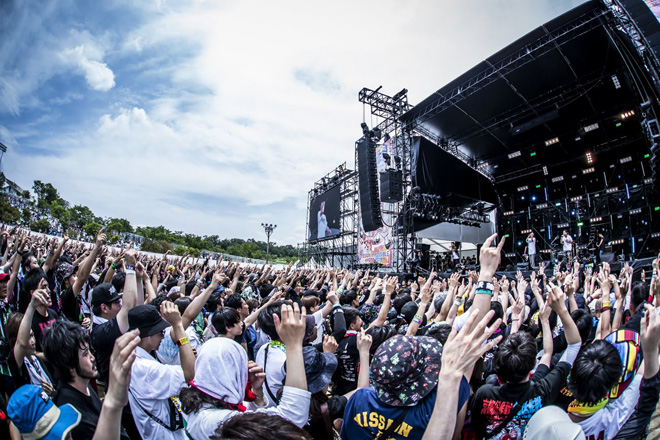 このバンドの登場ともに、太陽が全力で仕事をし出したのは気のせいだろうか。ピカピカの夏空で、気温がグイグイ上昇するなかステージに駆け込んできたのは、沖縄の5人、ORANGE RANGE。今回が初登場である。