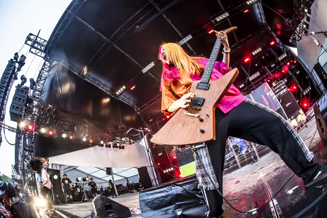 “夢は死なへん”と書かれたタオルなど、観客が高々とタオルを掲げたり、手拍子をするなか、笑顔で登場した3人はまず気合を込めるように大きな音をかき鳴らすと、「やっと言える。源氏ノ舞台! うちらの人生に、みんなの人生に、京都大作戦があってよかった」とあやぺたが叫びをあげた。そして1曲目に選んだのは、アップリフティングなメロディが最高な「Someday」。moAi(Dr、Cho)の痛快なビートが会場を駆け抜けていって、あやぺたといやま(B、Cho)がパワフルなボーカルのハーモニーを聴かせると、観客の興奮がぐんと上がって、雨も気にせずともに歌い、跳ね回る。「雨、止ませることしか考えてない」とあやぺたは曲中にも叫び、ノイジーにギターをかき鳴らして、源氏ノ舞台の熱気を上げる。そしてさらに「ドロドロになろうぜ」と攻撃的なギターリフを観客に見舞う「No Answer」へ。