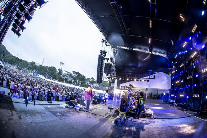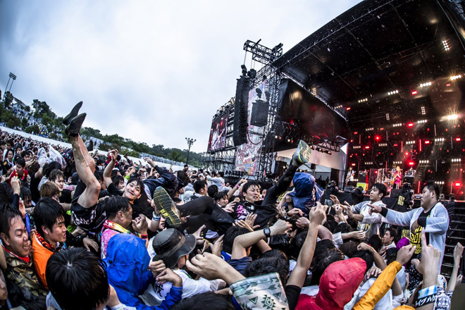 この言葉の後に演奏したのは、最新シングル「STRONGER」。まさに今のDizzy Sunfistそのものを音に変えた、馬力のある曲。ボリュームのあるアンサンブルは雨をはねのけるように響き、観客もその音に乗って自由に、歌い、暴れ、続く「Life Is A Suspence」でドロドロに。それでも笑顔で、「両手を貸してくれ」というあやぺたの言葉に高く手をあげて「Tonight,Tonight,Tonight」のブライトなメロディに合わせてその手を伸縮させる。「最高の景色や!」とあやぺたはいう。