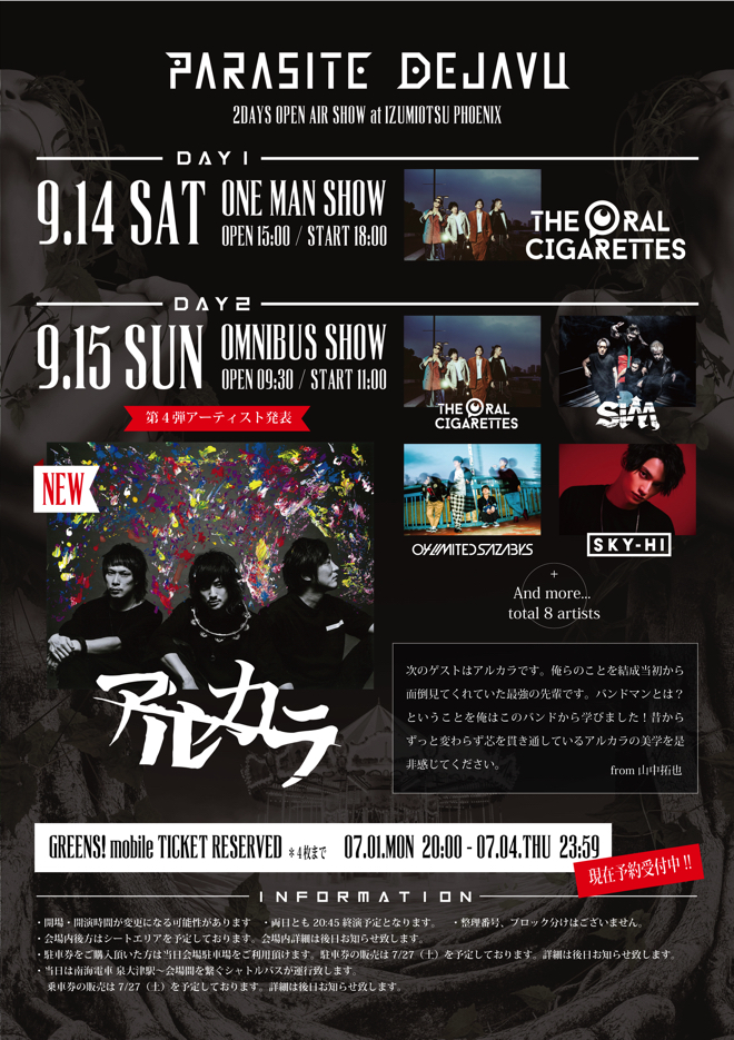 THE ORAL CIGARETTES主催<PARASITE DEJAVU 〜2DAYS OPEN AIR SHOW〜>はDAY1とDAY2の2日間にわたって開催される野外イベントだ。DAY1はTHE ORAL CIGARETTESのワンマンライブ。DAY2は以前、山中拓也が「オーラルの歴史上でこのバンドがいなかったら今のオーラルはない!というくらい大切な仲間達が出演する」と語ったオムニバスイベントとなる。チケットのGREENS先行は、本日7月1日よりスタートする。
