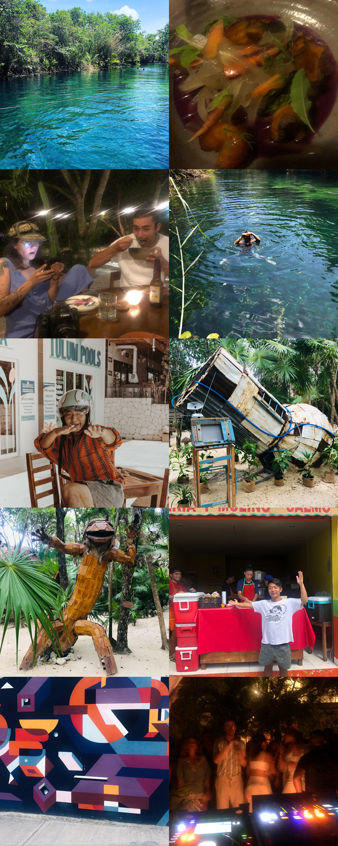 今回はJimenoとIrenaの家にお世話になります。次のギグは木曜日にCasa Jaguar TulumにてJimenoとの2人会。それまでトゥルム満喫! トゥルムは自然が素晴らしく、ゆっくりした時間が過ごせて、かなりリセットできました。セノーテ(編注:中米ユカタン半島の低平な石灰岩地帯に見られる陥没穴に地下水が溜まった天然の井戸、泉)、プール付きのジャングルの中にあるビラで泳いだり、ビーチ。自然に癒されて凄い幸せな時を過ごし、あっという間にトゥルムのラストギグCasa Jaguarとなりました。