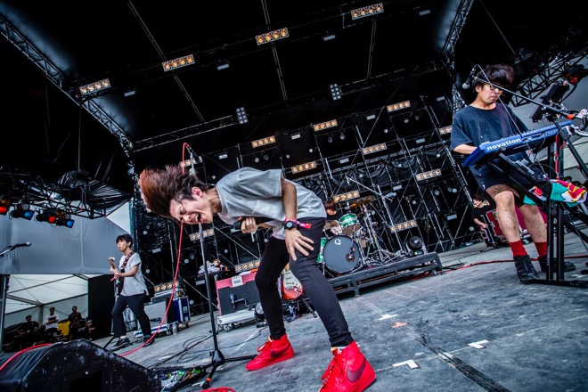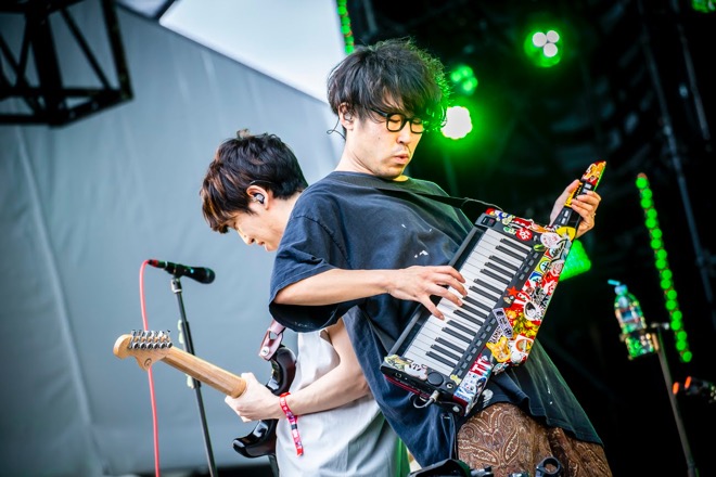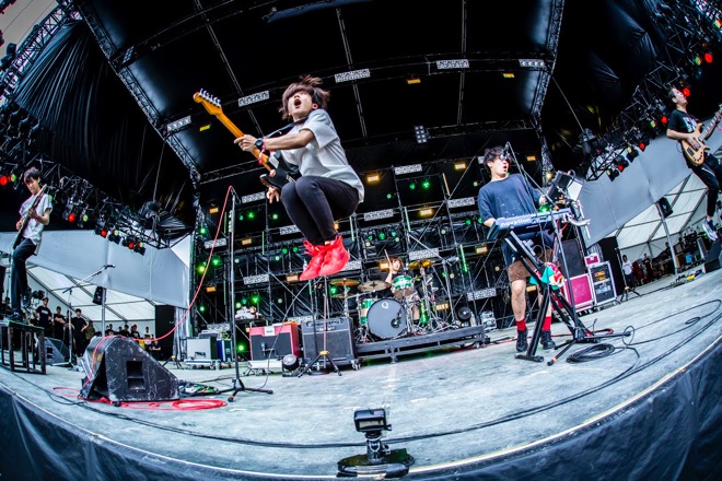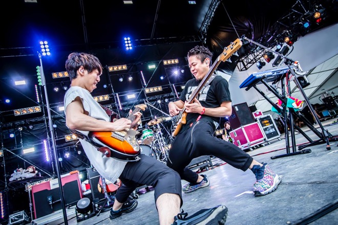 バンドサウンドと共にヤマサキ セイヤ(Vo/G)が「おはようございます! <京都大作戦>、3年ぶり!! 一緒に遊ぼう!!!」と気合いの入った挨拶を決めた。それを合図に「MEGA SHAKE IT!」が始まれば、ヨコタ シンノスケ(Key/Vo)がステージ狭しと動き回りながら煽る。オカザワ カズマ(G)もカワクボ タクロウ(B)も台の上に乗っかって、丘の向こう側にまで届ける勢いで弦をかきむしる。