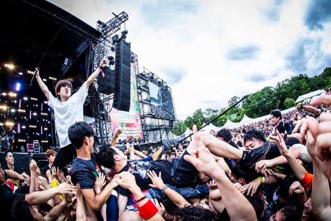 まるで応援団長のごとく一言ずつ力を込めて演説するヤマサキ。その言葉がオーディエンスの気持ちへさらに火を点けていった。「KMDT25」ではソゴウの叩く祭囃子に合わせ、でっかいサークルも生まれて、老若男女が肩を組んで踊る姿も。一足早い盆踊りだ。