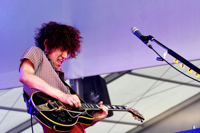 そして、60年代、70年代のロックのレジェンドたちが奏でてきた魔的で、リフやフレーズひとつで曲を決めてしまうくらいのインパクトやキャッチーさを持ったギターで「TV Show」へと突入。クラシカルなロックとモダンなダンスビートが衝突したサウンドで、オーディエンスの体を揺らしていく。ブルっとエンジンをふかすようなハスキーな松尾のボーカルに痺れる。そしてこの松尾の歌声が持つ独特の疾走感や高揚感が、最高に乗るのが「怒りをくれよ」だ。ダーティさもきらびやかさも内包したボーカルがサウンドを加速させると、ぶっといバンド・グルーヴがグラウンドごと揺るがしていった。
