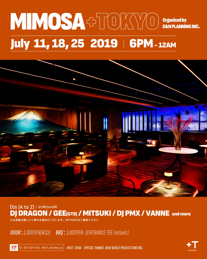 その<MIMOSA>が話題の新ベニュー「PLUSTOKYO」のルーフトップで当時と同じ毎週木曜日に復活をするとなった。DJ DRAGONをはじめ、GEE(GTS)、MITSUKI、DJ PMXといった大御所DJたちが集う<MIMOSA>。当時を懐かしむのはもちろん、あの伝説を体感したい人もぜひ足を運んでほしい。
