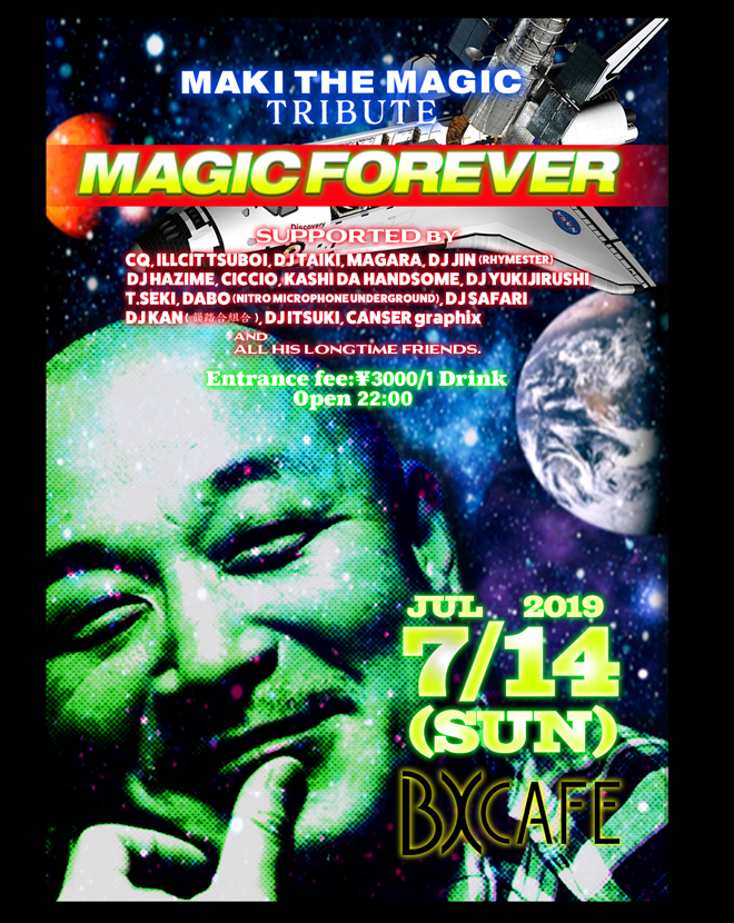 2013年7月14日に惜しくも亡くなった、キエるマキュウの一員であり、RHYMESTERやMSCなどのプロデュースワークなどでも知られる、DJ/プロデューサー/MCのMAKI THE MAGICのTRIBUTE PARTY<MAGIC FOREVER>が7月14日の6回忌のタイミングで渋谷BX Cafeにて開催することが決定した。