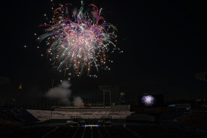 2019年の<神宮外苑花火大会>では会場を一部変更し、神宮球場、秩父宮ラグビー場、神宮第二球場に有料観覧席が設けられる。メインの神宮球場では今年も豪華ライブが行なわれ、秩父宮ラグビー場ではそのライブ映像を上映。これまでの軟式球場に代わって、神宮第二球場が花火の観覧席となる。