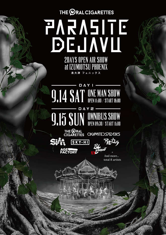 THE ORAL CIGARETTES主催<PARASITE DEJAVU 〜2DAYS OPEN AIR SHOW〜>はDAY1とDAY2の2日間にわたって開催される野外イベントだ。DAY1はTHE ORAL CIGARETTESのワンマンライブ。DAY2は以前、山中拓也が「オーラルの歴史上でこのバンドがいなかったら今のオーラルはない!というくらい大切な仲間達が出演する」と語ったオムニバスイベントとなる。チケットは本日7月12日より各プレイガイド先行、LINEチケット2次先行がスタートする。