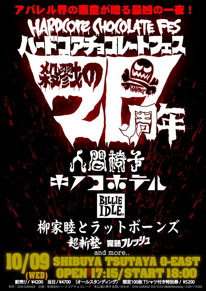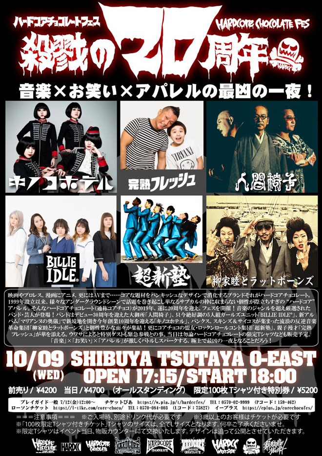 アパレルブランド・ハードコアチョコレートが10月9日、東京・TSUTAYA O-EASTにてブランド設立20周年記念イベント<ハードコアチョコレートフェス -殺戮の20周年->を開催する。