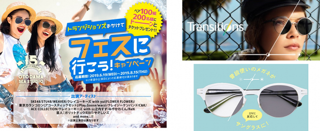 ニコン トランジションズは、光(紫外線)に反応してレンズの色が変化する調光レンズ。1本のメガネで屋内では通常のメガネとして、屋外ではサングラスとして、レンズが光に合わせて変化する(カラーバリエーション有)。ビーチではサングラス、ライブではメガネになるというまさに<OTODAMA>にふさわしい機能を備えたアイテムとしてこの機会にチェックしてみては。