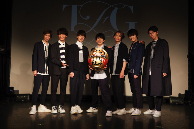 目前に迫ったメジャーデビューについて「ぶっちゃけ実感ないです。でも、ここからはアーティストとして自覚をもって、お客様を笑顔にできるように気を引き締めていきたい」と赤澤が現在の素直な心境を語ると、ここで金色の“特製TFGだるま”が登場!「令和の時代に……」とどよめきつつも、坂垣が「来年は東京オリンピック。TFGも芸能界で金メダルを取っていきたいと思います!」と力強く宣言し、「デビューシングルでオリコンTOP10入り!」(前川)を祈願して、筆を持った健人がだるまの左目を入れる。若干垂れた墨汁にも「これは嬉し涙」と上手いフォローを入れて、「TOP10入りを達成した暁には、もう片目を皆様の前で入れたいと思います」と佐藤が約束してくれた。