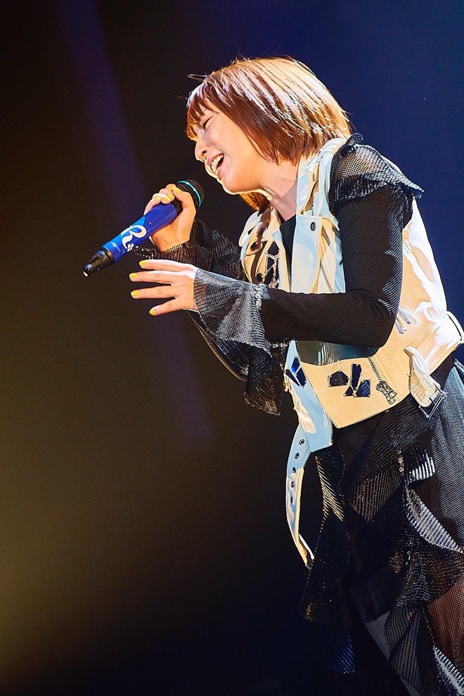 オープニングナンバーは最新アルバム『FRAGMENT』収録新曲「UNLIMITED」だ。激しいデジロックで一気に会場のボルテージを上げたステージは、「アイリス」「INNOCENCE」「シンシアの光」「流星」「IGNITE」といったソードアート・オンラインシリーズのヒット作品も散りばめられていく。