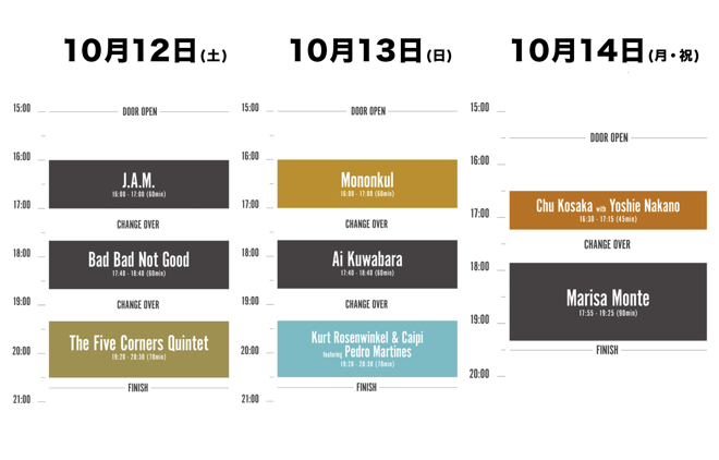 出演:J.A.M(12日)、バッドバッドノットグッド(12日)、ファイブ・コーナーズ・クインテット(12日)、ものんくる(13日)、桑原あい(13日)、カート・ローゼンウィンケル & カイピ フィーチャリング・ペドロ・マルチンス(13日)、小坂忠 with 中納良恵(14日)、マリーザ・モンチ(14日)