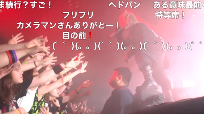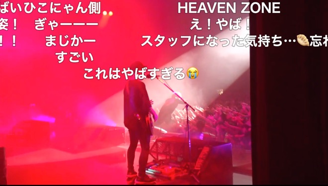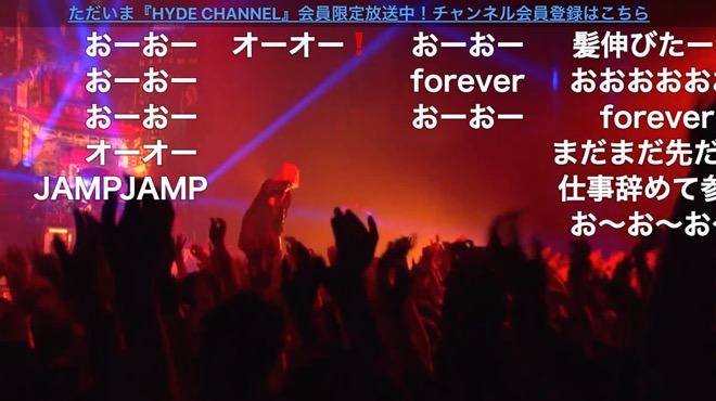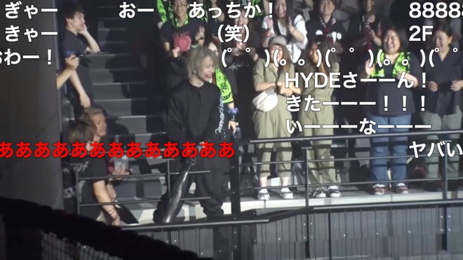 そして、いよいよライヴ本編がスタート。『HYDE CHANNEL』のカメラはまず、後方関係者席へ。さらには次々と会場内を移動し、下手側、舞台袖、2階席、1階最前列など、臨場感あふれるライヴ生中継が放送された。まるで最前列でライヴを体験しているかのような迫力ある映像と音声には、感動のコメントが絶えることなく画面を埋め尽くした。