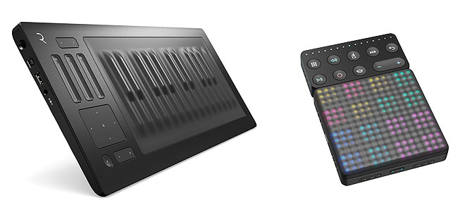 ▲展示ブースには次世代キーボード「Seaboard RISE 25」(写真左)、「Seaboard RISE 49」、新製品のポータブルなビートメイクセット「Beatmaker Kit」(写真右)はじめ「BLOCKS」シリーズ現行製品を用意。実際に試すことができる。