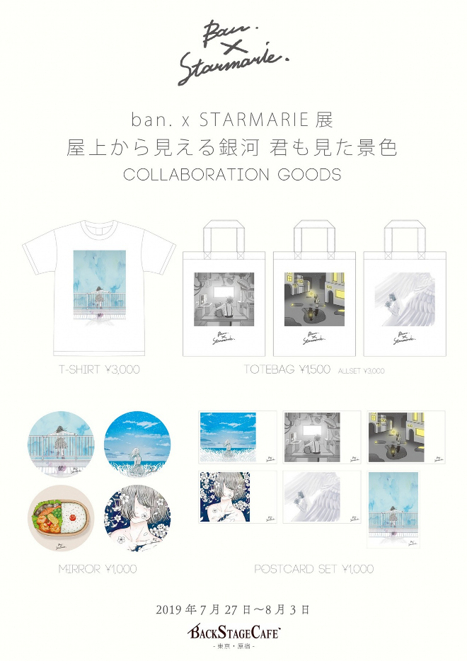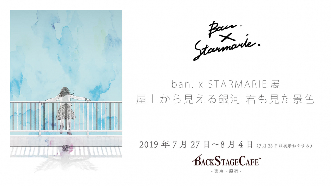 STARMARIEとイラストレーターban.によるコラボ展<屋上から見える銀河 君も見た景色>が、原宿 Backstage Caféにて7月27日(土)~8月4日(日)の期間で開催される。