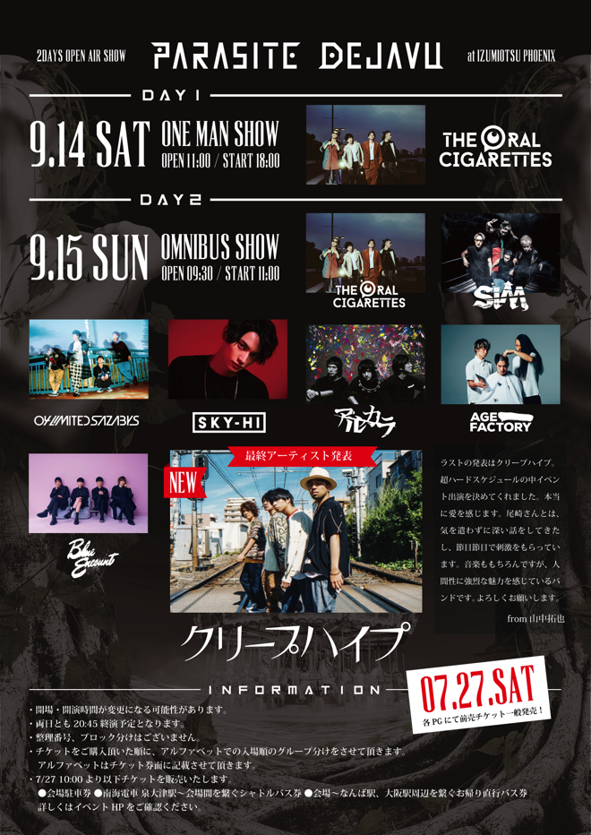 THE ORAL CIGARETTES主催<PARASITE DEJAVU 〜2DAYS OPEN AIR SHOW〜>はDAY1とDAY2の2日間にわたって開催される野外イベントだ。DAY1はTHE ORAL CIGARETTESのワンマンライブ。DAY2は以前、山中拓也が「オーラルの歴史上でこのバンドがいなかったら今のオーラルはない!というくらい大切な仲間達が出演する」と語ったオムニバスイベントとなる。チケットの一般販売は7月27日よりスタートする。