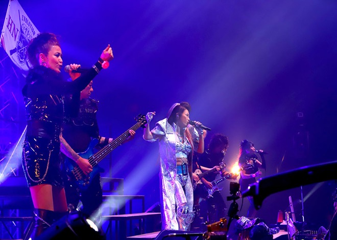 第2部のスタートも第1部同様、映像を使ったもの。前出のアヤナが大人になり、2039年の近未来が舞台だ。AIやBIに侵食された世界。人類に“情緒”を取り戻そうとサイボーグとなったMAKIが立ち上がるところからステージの幕が上がった。1曲目は「EXPLOSION」。スクリーンが上がると全身メタリックな衣装に身を包んだ大黒摩季、メンバーも戦闘服をイメージした衣装に身を包んでいた。2曲目「FIGHT★GO☆FIGHT ~戦え BLOODY HEART~」では、アルバムにも参加した元JUDY AND MARYのTAKUYA(G)が同様の戦闘服で参加し、絶妙のソロを聴かせた。