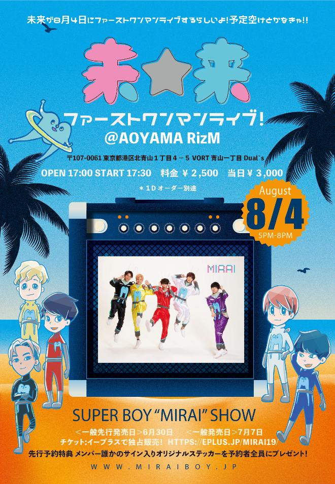 2019年5月にデビューしたメンズアイドルグループ・未来(ミライ)が、1stワンマンライブを8月4日(日)青山RizMにて開催することが決定した。