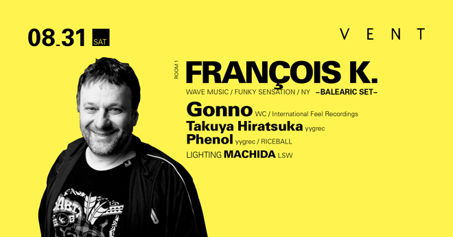 世界で最も音楽的影響力を持つパーティとして認知されているサンデーアフタヌーンパーティ<Body & Soul>を主催する、ダンスミュージックシーンの最先端で活躍を続ける驚異的アーティスト、フランソワ・ケーが8月31日に表参道VENTにカムバック、なんと今回は初となるバレアリックセットを披露する。