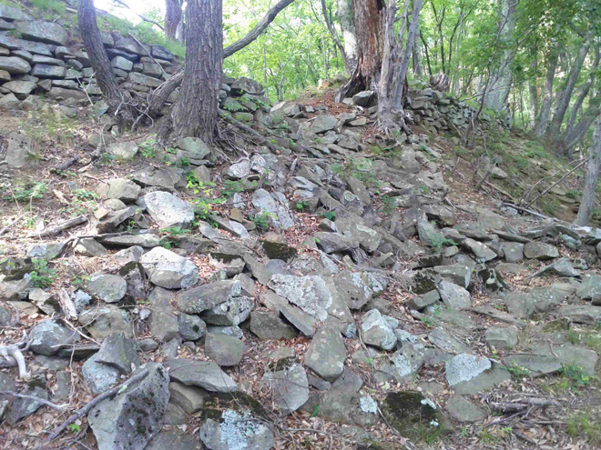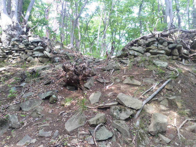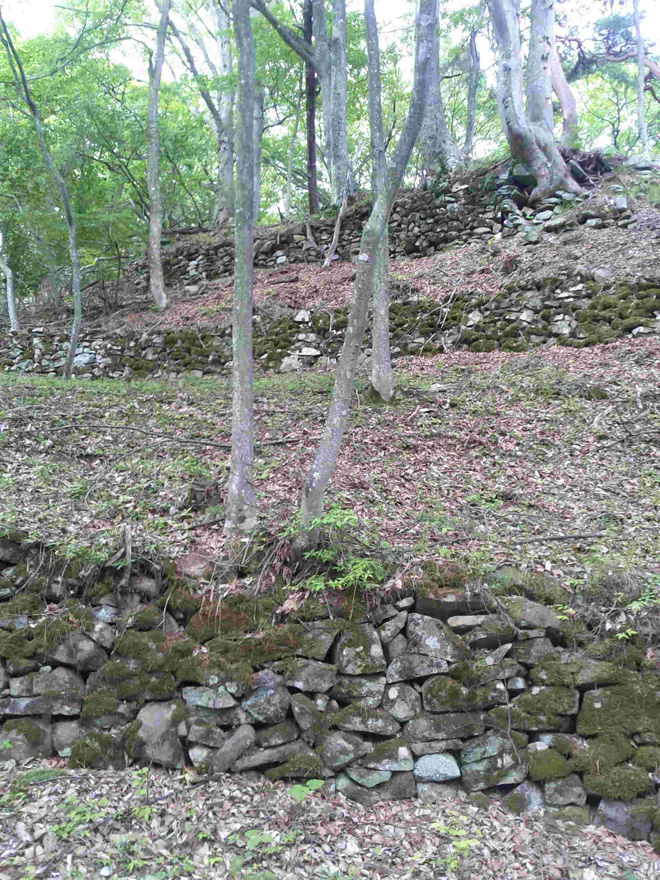 もう一つの二重堀切&門跡を超えたあたりからがいよいよ城のメイン部分となる。もしかすると本来はただひたすら真っ直ぐに伸びた道を登り、本丸の真下まで行くという道順が正しいのかもしれないが、見学するにあたり一度左にルートがそれるようになっている。そこから竪堀をいくつか渡るとさっきとはまた規模の違う段の曲輪がいくつも存在する。上を見上げると石垣の曲輪が見える。突如現れるこの石垣に痛く感動。そしてその石垣がいくつもの段になり、端から端までびっしりと石垣で埋まっているではないか。高さはそこまで稼げてはないが、この牛蒡積みの石垣に圧倒される。面白いのはこっちには登り口がないのにも関わらずここまでの頑丈な防御にしてあるということだ。もしかすると、こっちから攻められることを一番警戒した上で城内の道を今ある方に作り直したのかもしれない。だが途中からこの石垣、石段も虎口があったり、門跡がある。いくらか家来も行き来していたことがわかる。そのまま石垣を登って行くと本丸の下の曲輪に差し掛かる。本丸は不等辺の形をしており、安土城の天守台と同じような雰囲気を持つ。ここはかなり石垣が崩れているが、その崩れ方になんだか涙が出てしまった。こんな山奥に、これほどまでの石を運び、そして組み、戦いに備える。明日へも知らぬ戦国の人生、いつ死が来てもおかしくない人間の覚悟が、ここにまだこれほどまでに残っていることに痛く感動したのであった。凄いなんて言葉では足りない。本丸入り口もきっと虎口になっていたはずだろうが崩れ具合が半端なく、本丸に入るにはちょっと危険でもあった。どの場所も今にも崩れ落ちそうな石垣なので注意して登っていただきたい。考えてみたら石垣が組まれていない曲輪や土塁にもちょっとだけ石が落ちていたりしたが、上から崩れ落ちてきた石が転げ落ちてきたことがイマジン出来る。