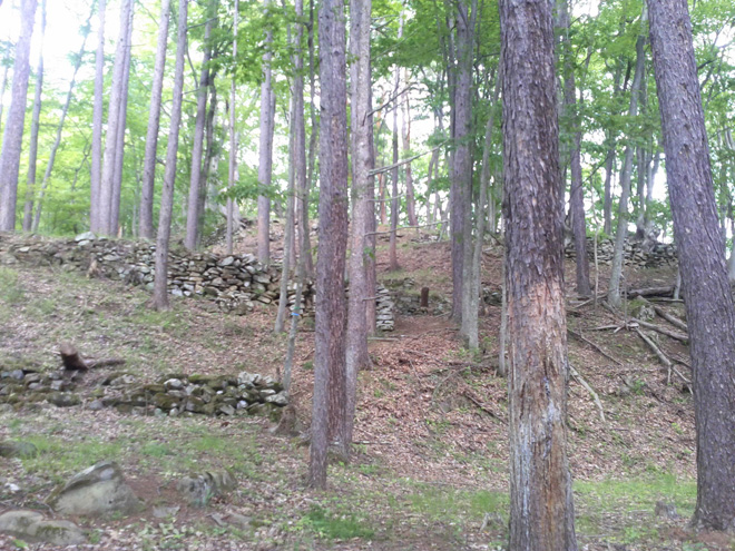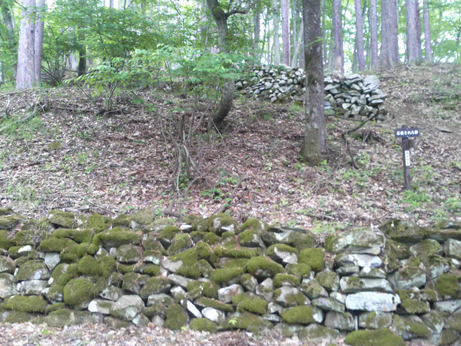 帰りは本丸裏にある犬走りの曲輪から大手道に向けて城を右に見上げながら退散したのだが、左は竪堀と断崖絶壁、右はどこを見ても崩れ落ちた石垣、幻想的にもほどあった。最初に左に曲がった曲輪まで来て、そのまま降りずにもう一度城を一周見学をしてしまったことは言うまでもない。まさにおかわり。城の規模は小さいのですぐ廻れる。とにかく凄い。大きさからすると砦のような規模と言えるかもしれないが、本城と言っていいほどのクオリティ。この名城にやっと来城出来たことを誇りに思う。この城に関しては色々と整備してくれなくても良いんじゃないかと言う気持ちにもなる。自分のイマジンで見学出来る城として完璧なんではないだろうか。攻められない為に、威嚇の為に、徹底したアイディアが施されている。少しくらいわかりづらい方が戦国時代の戦い方をイマジン出来るのではないかと思う。当時はどれほどの木が生い茂っていたのかも興味深い。当然竪堀には木が生えてなかったはずなので遠くから見たら山の斜面に所々隙間の空いた面白い形をしていたのかもしれない。今でこそ外観は普通の山である。それが一歩踏み入れるとこんな城が残っているのかと痛く感動。きっと次に来た時はまた石垣が崩れてしまっているのだろうな。そういうのも切ないが、この城に関してはそうあっても良いのかなとも思う。