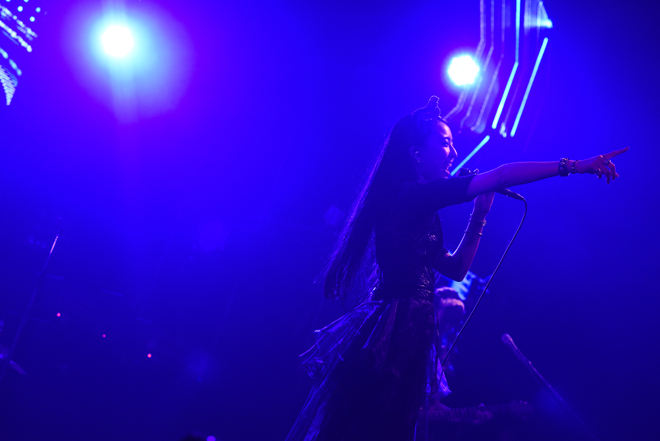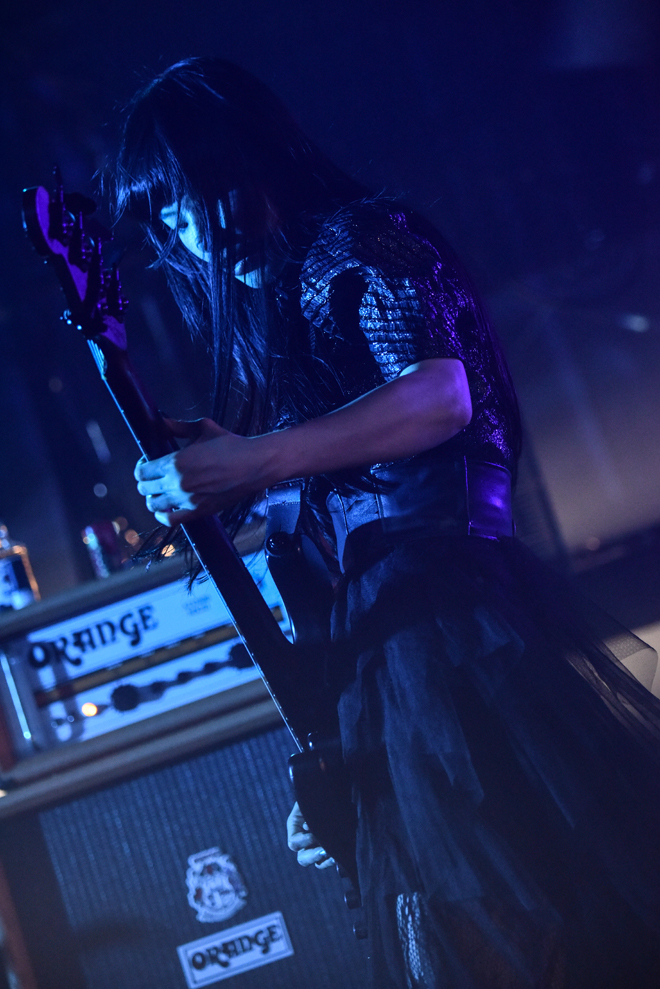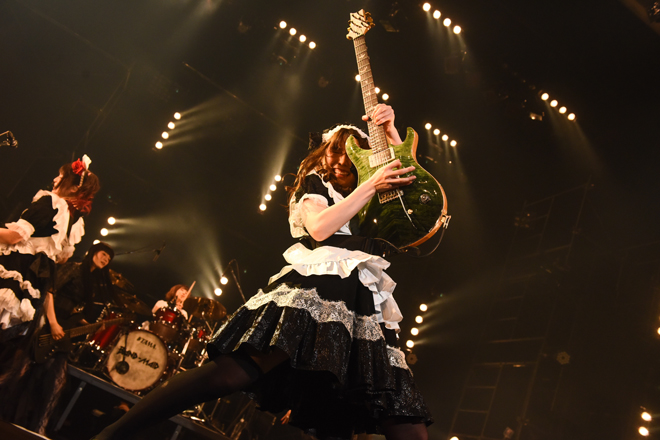 そして「新曲持ってきました!」と前のめりなアッパーチューン「輪廻」が披露され、新たな引き出しが次々に開けられていくようなライブ運びに場内はもはや沸騰状態だ。繊細さと大胆さ、クレージーさを合わせ持つ日本が生んだギターヒーローならぬギターヒロイン、KANAMIのソロセクションでは“歯弾き”も飛び出し、「モラトリアム」では大シンガロング。その半端ない一体感に彩姫も思わず「最高!」と叫んだ。BAND-MAIDのハードロック魂炸裂の「Play」を投下し、ラストナンバーは走り抜けるようなナンバー「you.」。
