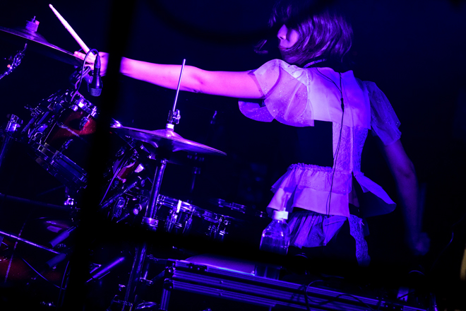 各自のソロパートも堪能できるインストナンバー「onset」でも、その実力を見せつけ、彩姫が戻るとお給仕はなごやかなMCタイムに。小鳩が「暑いっぽ!」と言うと彩姫がクールなトーンで「暑いですか? 鳩さん」と返し、鳩にひっかけて「焼き鳥になるっぽ」と小鳩がジョークを飛ばすと「焼き鳥でも蒸し鶏でも美味しくなさそう」と彩姫。そしてホールの2階席が高いことからKANAMIが高所恐怖症であることを小鳩が明かし、KANAMIがロリータボイスで無邪気に手を振りながら「いちばん後ろの高い人、大丈夫ですか~? 見えてますからね」と声をかけると場内は速攻でほっこり。しゃべると独特な空気にしてしまうKANAMIの不思議キャラについて彩姫が話すと小鳩が「超音波かなんか出てるんじゃないの?」と笑わせた。